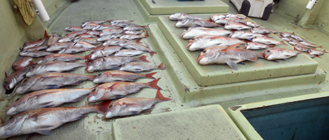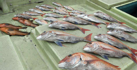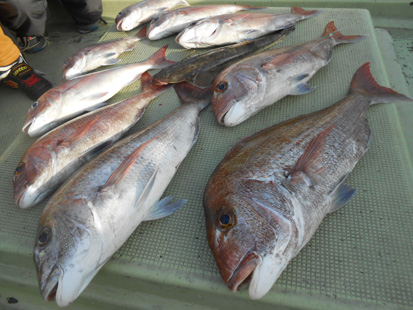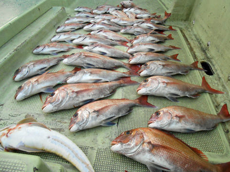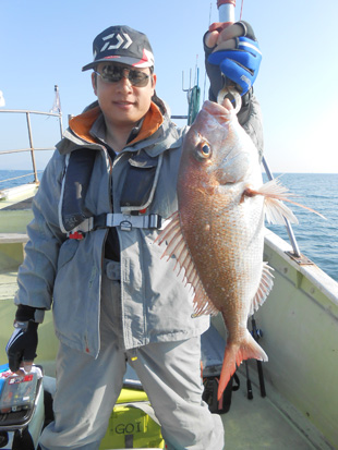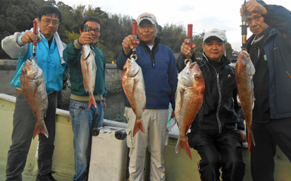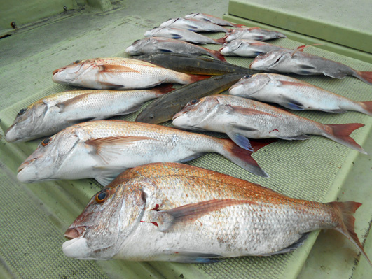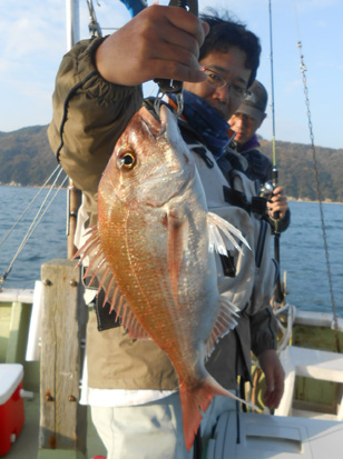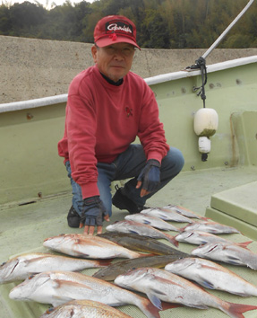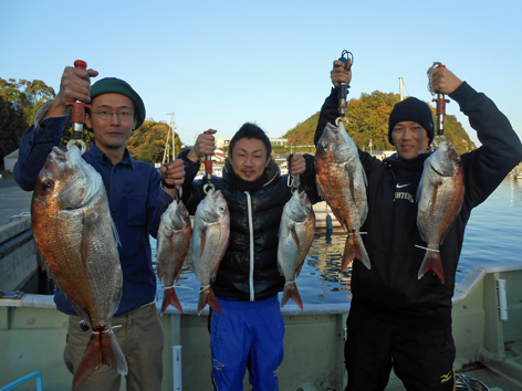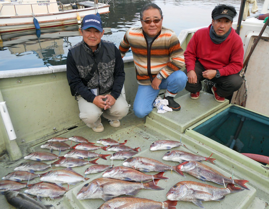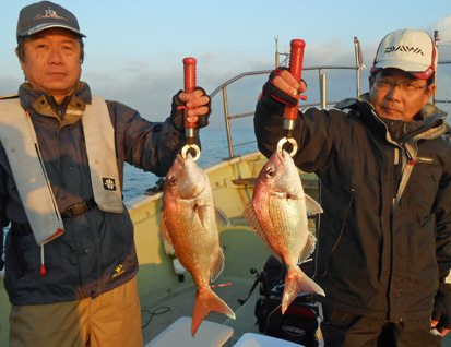 本日は変則2名様の乗り合いで出船。 朝一からダブルヒット。 頼むからあんまり釣らんでよ。資源の枯渇化(笑) 順を追って、マダイ、マゴチ、アコウ(クーラーイン)。 お二人にしては見事な釣果。 ネクタイカラーのチョイスが良かったのか腕が良かったのか? (当然、腕ですよね) (11月21日)
