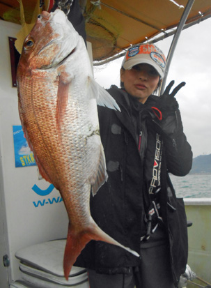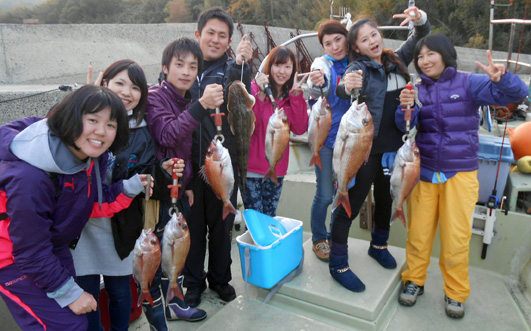 本日は乗船時に目が点に!! 美人ばかりで・・・・。どこかのモデル集団? いや、そうじゃなくてこの方たちにマダイを釣って頂くには…。 先日のテレビ収録は散々で潮止まりの取材でした。 で、気を取り直し何とか釣って頂こうと頑張りました。 結果はご覧の通りで皆さん、大型マダイを複数ゲット。 それも全員安打。 潮待ちには大型マゴチも3匹。 え、この人たち実はタイラバの経験あるのでは? でも、全員レンタルでリールの使い方からレクチャー。 びっくりしたのはレクチャーの時にヒット。(船長が下手糞だから逃がしました) で、皆さんに頑張って頂いて?(ほんまかア?ラーメンすすってたの誰や!!) ロクマルクラスも上がるし地合には連続ヒット。 ま、とりあえず今夜はマダイぱーちぃーかな? 船長も呼んで欲しかった1日でした。 グループでなくてお一人様からでもご乗船できますので宜しくお願いします。 (11月23日)