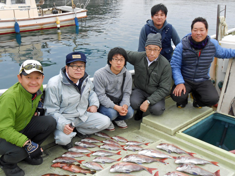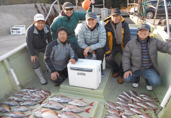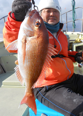 本日もタイラバで頑張って頂きました。 地合到来の時は4人が一度にヒット。これが何回も。 大型は60サイズが数匹。 皆さんに本年の釣り納めを楽しんで頂きました。 皆さん、もう満族との事で本日も早上がりにしました。 皆さん、二桁の釣果でした。 (12月27日)