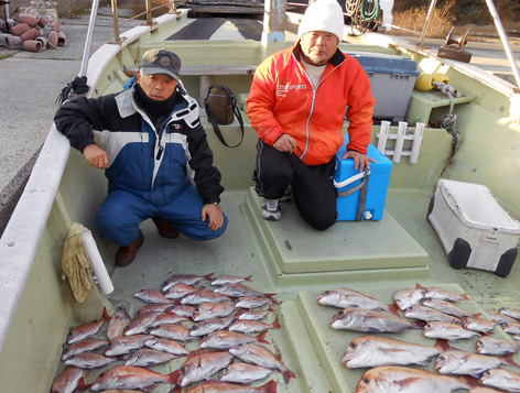本日はドタキャンが有り変則2名様で出船。 ポイント到着すぐから当たりが有りピークにはダブルヒットも。 北西の風が強く寒さが厳しかったので早目の撤収としました。 ちょっとしたコツでヒットに持ち込めます。 (12月26日) ・・・・・・・・・・・・・・・・・・・・・・・・・・・・・・・・・・・・ ちょっとした事情が有り釣果を載せておりませんでしたが これからはどしどし載せてまいります。