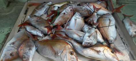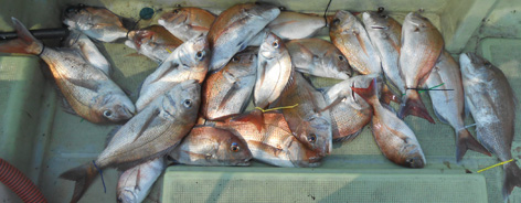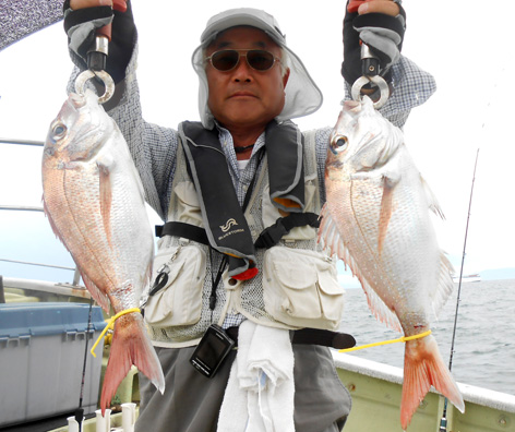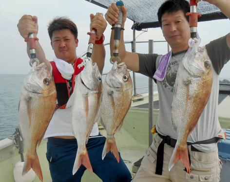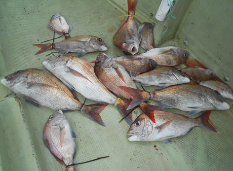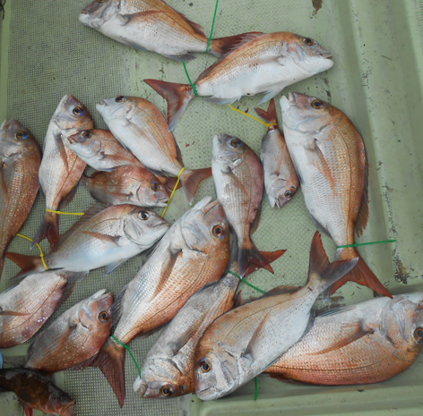 最近は無風状態で暑い日が続いております。 しかし、タイの活性は良いようで地合にはバタバタと。 暑さ対策を万全にお願いします。 この暑さですからデッキに並べて全体釣果写真は掲載しておりません。 天候が悪い時は極力掲載します。 魚の鮮度を考え〆て即、クーラーインです。 (7月20日)