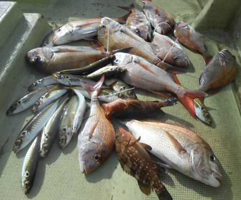 本日は変則2名様で出船。 まずは寄り道してアジ狙い。 入れ食い状態だったので30分程釣ってタイラバに。 まだ、釣れていたのですがそれほど釣っても…。 アジの釣果写真は一部です。 タイラバはラインブレイクも有ったりでかなりの感触でした。 船頭も少しアジを持ち帰り食べてみましたが、これなら納得。 (8月20日)