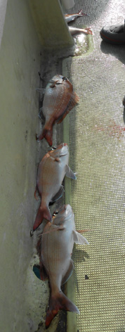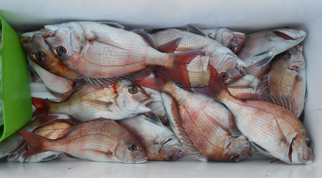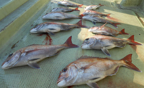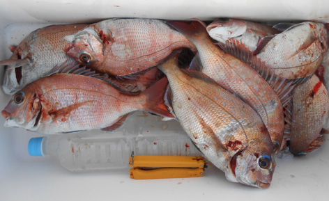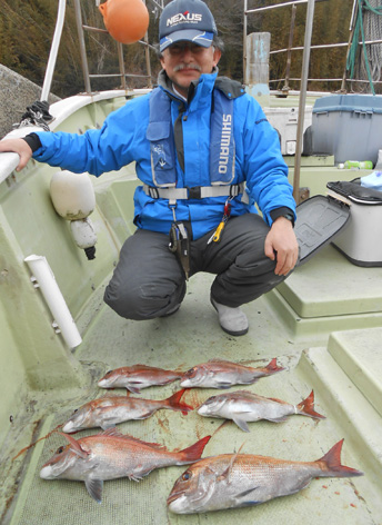 本日は5名様の乗り合いで鯛サビキ。 途中、当たりも無い時間も有りましたが スーパーラッシュには全員の竿が曲がり連掛けも有りました。 おひとり平均で20枚で船中3ケタとなりました。 (2月28日)