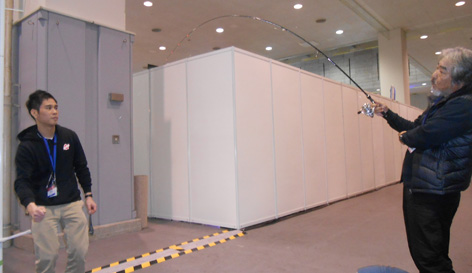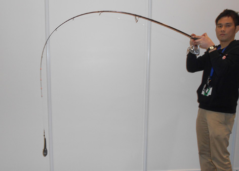 フィッシングショー大阪でサクラのブースを尋ね 今回発売されるキャスティングロッドを見させて頂きました。 非常にバランスの良い竿に仕上がっていました。 写真右は200号の錘を掛けた竿の曲がりです。 ブース裏にて。 (2月6日)