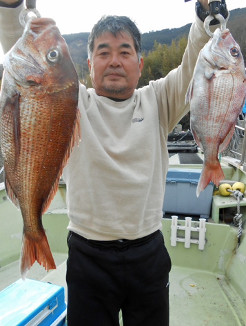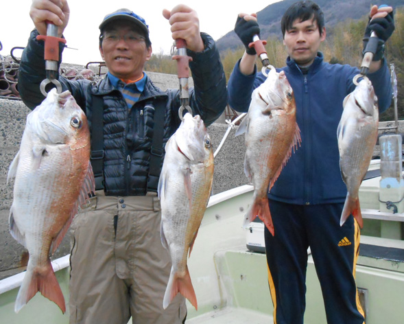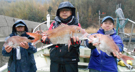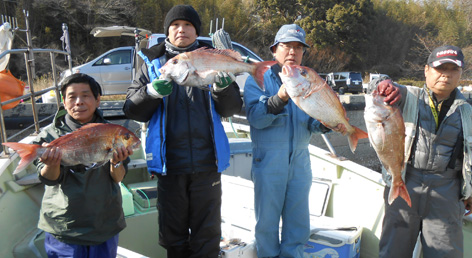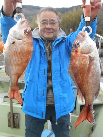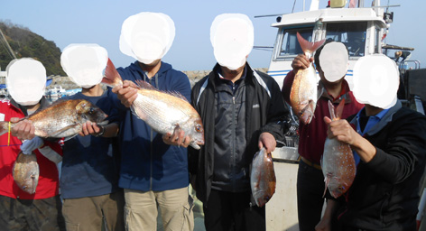 乗り合い3名様で小物は潮待ちのみで大物一本勝負。 皆さん、大物を手中にしました。 なかには針が伸びる程のアクシデント。 今夜はお刺身から始まって鯛しゃぶ、アラ炊きなど。 寒の絶品マダイを堪能できると思います。 (3月5日)