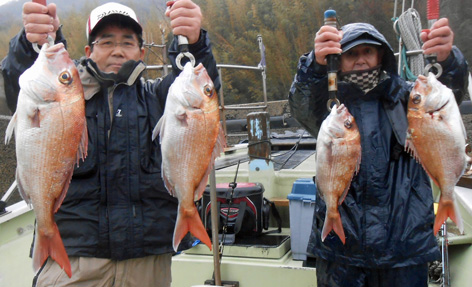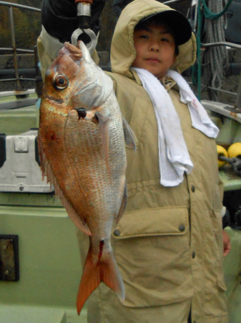 本日は朝から凄い霧!! 本日ご予約いただいたお客さんには安全を考慮して出船中止いたしました。 次回のご予約ありがとうございます。 で、だんだん霧が薄くなってきたので以前から依頼の有った鯛をちょっとだけ。 通常ポイントで地合待ちをしてましたがイマイチ。 今季、まだ入っていないポイントで試し釣りをしました。 当然、マル秘ポイントだから1隻も船がいないのでのんびりと竿が出せました。 64pまで9枚の釣果で依頼の有った8枚に達したのと雨が降り出したので 早々にポイントを後にしました。 釣果は全て40p以上でした。 (3月18日)