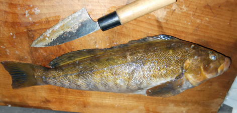 雨の中、ジギングで挑みました。 釣果はマダイ、チヌと写真のビール瓶アイナメでした。 (3月29日)