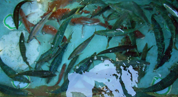本日はキャンセルが有り友達のお子さんを借りて?アジ・サバの調査に。 ポイントに着いてウロウロしていると大きなナブラを発見。 それからは怒涛の入れ食いモード。 船長は竿を出さずに取込だけのお手伝い。 なんと、1時間ほどで50本の釣果。 4号ハリスはブチブチと切れまくりでした。 一番大きかったサバは軽く50センチを超えていました。 (釣果写真は後日、お父様から頂いてアップします) 今年は過去になかったゴマサバも混じっています。 夏が旬のごマサバはとても美味でした。