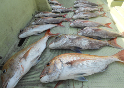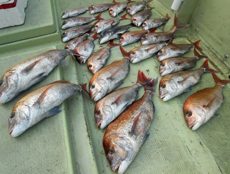 本日は午前中にアジ狙い。 爆釣モードが続き皆さんのクーラーはずっしり。 鯛を入れるスペースがなくなるのでお客さんからストップコール。 本日のアジは大型で体色まで黄色、絶品でしょう。 タイラバは中盤からラッシュモード突入。 ひとつテンヤには大型がヒット連発。 生簀にまだ残っていますが取敢えず釣果写真。 本日は楽しい一日となりました。 入りきらない釣果は発泡スチロールに(笑) (船長より:内田さん、ありがとうございました。絶品でした。) (9月14日)