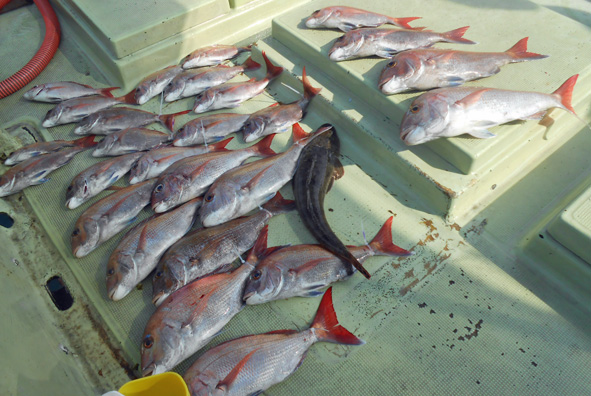 毎年ですが全体釣果を撮りたいのですがこの暑さでは直ぐにクーラーイン。 熱くなってるデッキに並べると鮮度が落ちます。 美味しく頂くには〆る、氷水で魚を冷やす、ク―ライン。 家に持ち帰り内臓が臭いようでは最低。 先日、鮮度優先で持ち帰り鯛飯と荒汁を作りましたが最高でした。 かなり脂が乗ってきました。 生簀は常に海水を循環させストレスなくするのが良いです。 (7月21日)