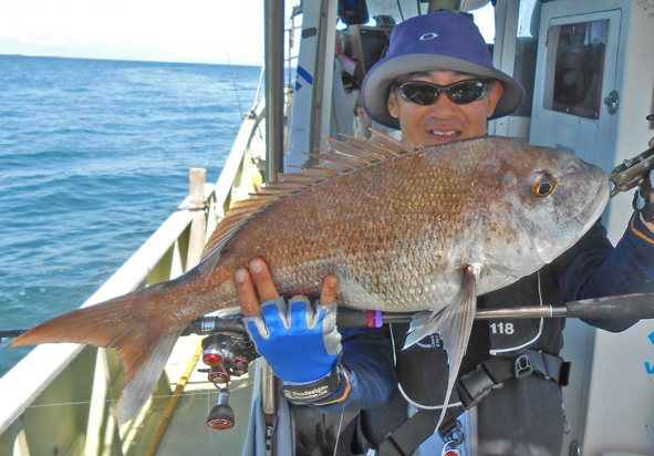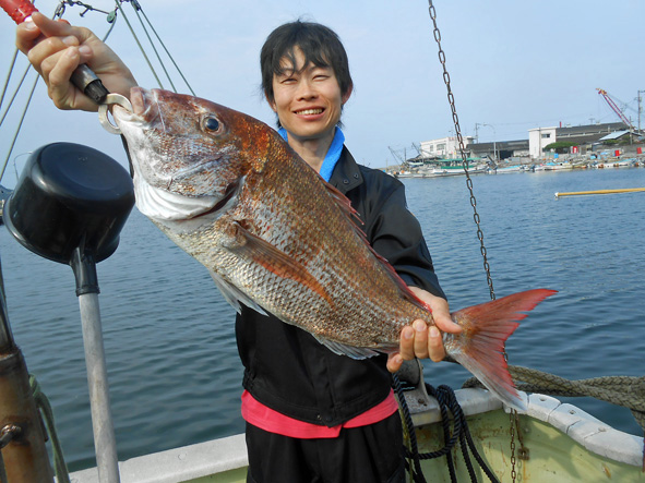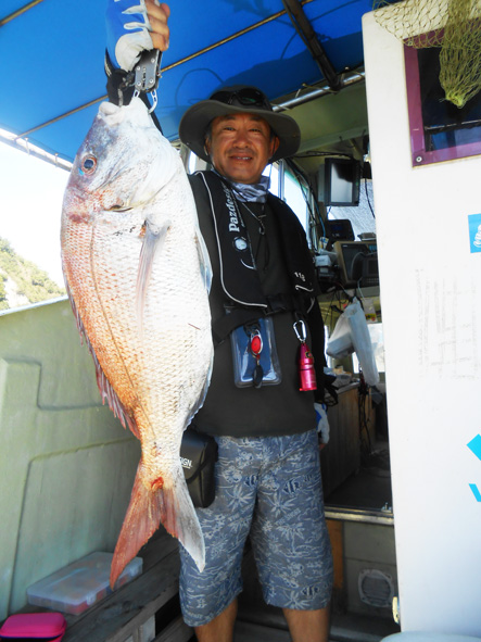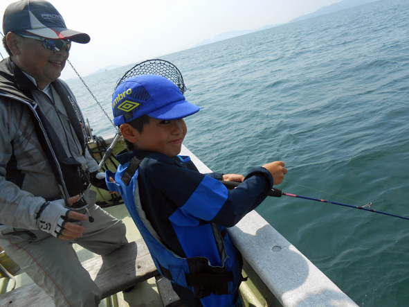 まひろ君が3枚目のマダイと挌闘中!!余裕の顔です。 釣果は3枚とも50オーバーでした。