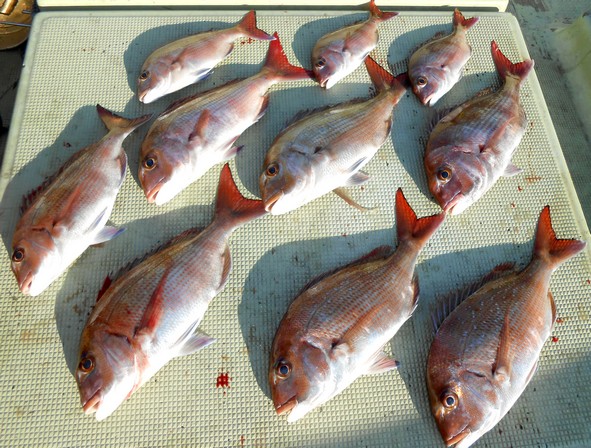 2桁の釣果 今年は風の強い日が続きなかなか出船できません。 本日は天気も良く釣り日和で常連さん2名で出船。 釣果は何とか2桁をクリアーできました。 (1月26日)