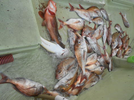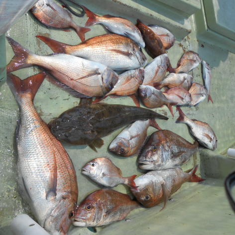 8種目達成!? 本日はキャンセルがあり常連さんお二人に連絡。 気持ちよく乗船していただき気になるポイントを探索。 正解で最大は70cmジャストの大型マダイ。 マゴチは80cm越えでした。 また、本日はいろいろな魚が釣れました。 タイ、マゴチ、アコウ、ニベ、ヒラ、グチ、サメ、ツバスの8種目。 釣果も十分と言う事で暑くならないうちにと昼前にポイントを後にしました。 まだまだ、釣れていたのですがこれくらいならご近所にも配れます。 (8月4日)