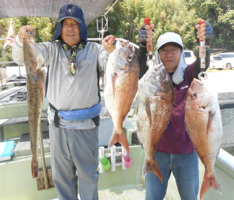 絶好調の釣果! 本日も落とし込みとタイラバで出船。 小潮周りで潮が動かないので落とし込みを重点的にやりました。 イワシに付いたマダイはイワシを食べているのでまんまると肥えています。 ポイントに入ると皆様の竿が弓なりに。 楽しい一日となりました。 ちなみに、鎌田様グループには感謝です。 下船前に船の中を奇麗に掃除していただいておりました。 ありがとうございました。 (8月24日)