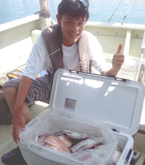本日は早朝に出船して暑さを避けました。 たっちゃんが自己ベスト枚数を更新しました。 クーラーは満タンでした。 本日はリリースサイズは2枚のみで70弱まで釣れました。 釣ったタイは天ぷらで食べていただいたそうで最高の味だったようです。 写真のお皿8皿を完食されました。 タイは皮を引いて天ぷらに天つゆより塩の方があっさりと良いみたいです。 (8月19日)